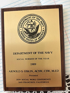 Oskin’s next stop was the North Chicago VA hospital at Great Lakes, where he worked on triage and mental health acute psychiatry for the next 8 years. During that time he was also completing his second Master’s Degree, in Psychology, at Loyola of Chicago. In 1982 he was hired by Great Lakes Navy Base as Deputy Director of the Fleet and Family Support Center. He and his team of 55 social workers, psychologists, nurses, chaplains and other personnel handled everything from domestic violence cases to suicide prevention. “I would review police blotters every morning with the chief of police of any domestic violence cases that were coming through and we would take charge of their case, whether child abuse, spouse abuse, sex abuse, assault. Whatever it was we’d evaluate and get them into a treatment program.”