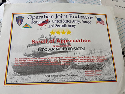 Oskin did go back into active military service briefly in 1996, as part of Operation Joint Endeavor. NATO forces, including Americans, were being sent into Kosovo and Yugoslavia to stop mass killings. Because Oskin had developed a treatment program for families suffering domestic violence, he was sent to Germany to coordinate support for families of soldiers being sent into combat zones, and for the soldiers themselves. Oskin had been promoted to Lt. Colonel in 1988, and became acting chief of Social Work at Wurtzberg Military hospital. Long before Zoom and FaceTime, Oskin was using satellites to treat troops in the field. He received a commendation for the treatment program for domestic violence, and developing a parent university for the families of those left behind. “I helped people share how to cope, how to mentor, how to run a boy scout or girl scout troop, sharing skills like crocheting and knitting with children whose parents had gone into the field.” He even started the first certified babysitting training for teenagers, which proved a huge boost to the command.
