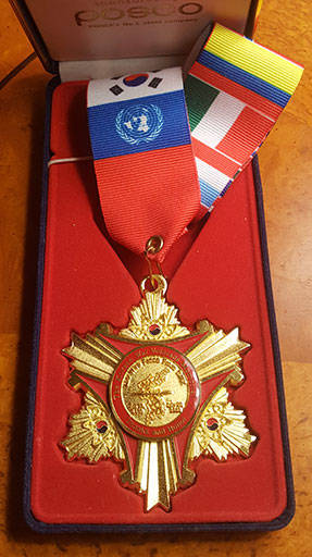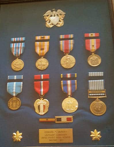During his years of service, he received 3 bronze service stars, and 2 Presidential Citation medals- one from the US Secretary of the Navy and the other from the President of the Philippines. In 2014 while living in Fort Lauderdale, FL, the American Legion presented Ed with a Thanks and Honor medal from the People of Korea. In the center of the medal is a piece of the barb wire fence that separated North and South Korea.