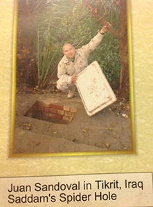 General Altshuler who was in charge of the Army Civil Affairs and Psychological Operations Command stopped by to thank Juan for his work and dedication. When Saddam Hussein was captured, the antiquities team was working in the town of Tikrit and was sent to investigate Saddam’s hideout. Juan had his picture taken next to the entrance. His 9-month tour ended and he returned to Chicago. Almost immediately, Juan was ordered to Fort Bragg, North Carolina, to help the Operations Officers in notifying Army Reserve units throughout the U.S. that they were being activated for service in Afghanistan and Iraq.
