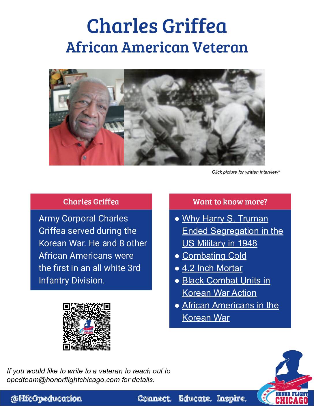 During the Korean War, President Truman ordered full integration of US Troops. In November 1950, Charles Griffea was drafted into the Army from his assembly line job at the Pontiac Automotive plant in Michigan and became one of those troops. Charles and other black personnel from his training group at Fort Campbell, Kentucky, were assigned to the all-white 3rd Infantry Division from Georgia. Despite there being “a few problems” with the arrangements, the men “were all too busy trying to stay alive” and all worked as a team to defeat their common enemies: the Chinese, the North Koreans and the bitter weather.