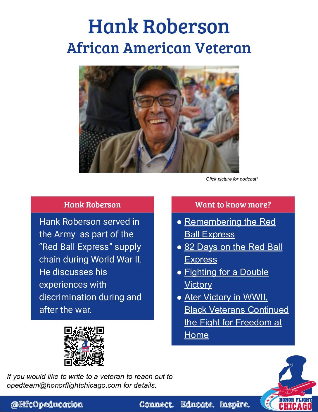 Hank Roberson served in the Army as part of the “Red Ball Express” supply chain during World War II. He discusses his experiences with discrimination during and after the war. Click on the image below to download the PDF with its embedded resources!