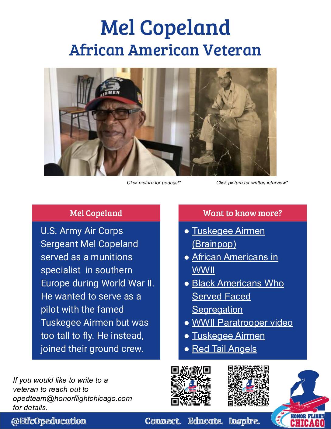 U.S. Army Air Corps Sergeant Mel Copeland served as a munitions specialist in southern Europe during World War II. He wanted to serve as a pilot with the famed Tuskegee Airmen but was too tall to fly. He instead joined their ground crew. Click on the image below to download the PDF with its embedded resources!