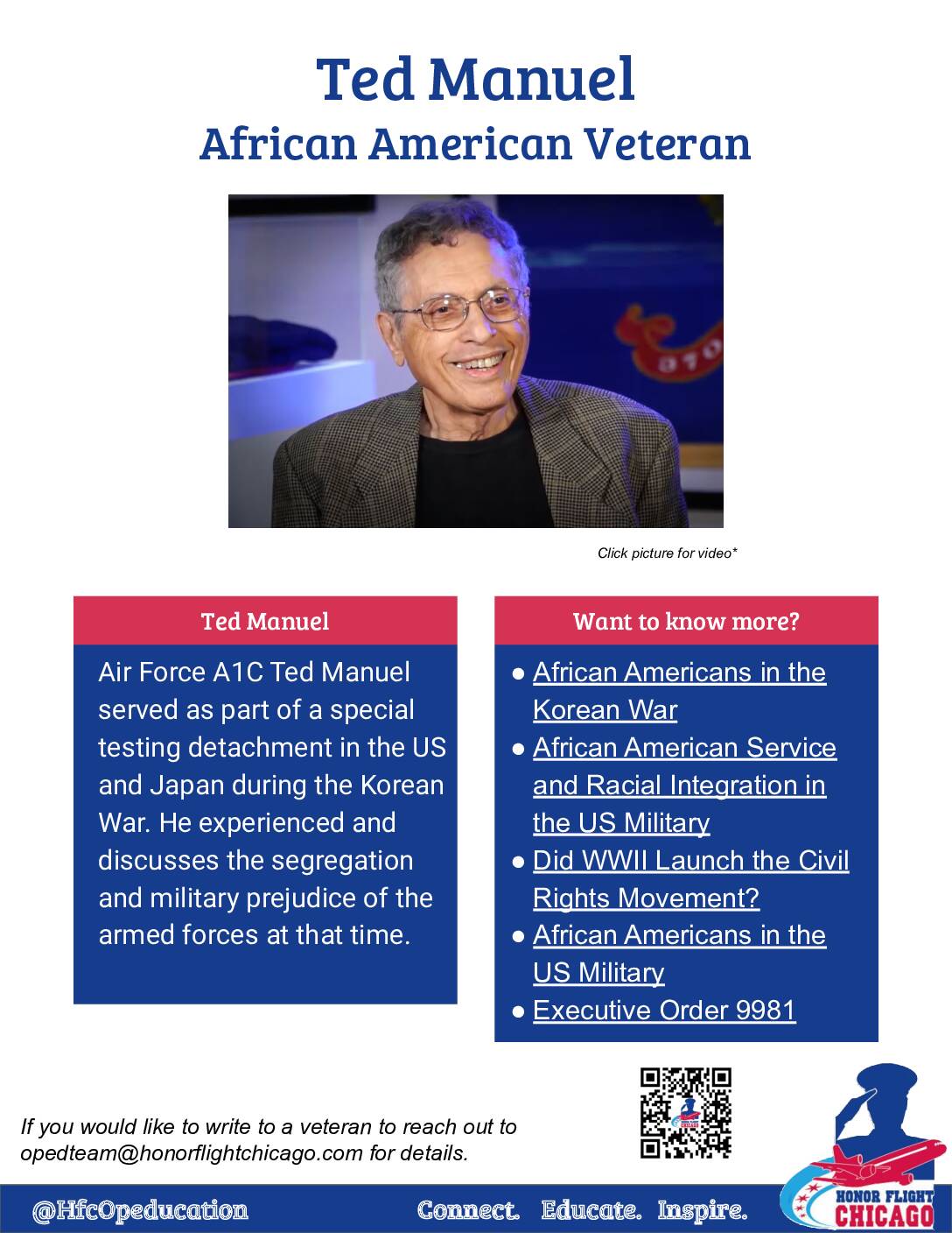 Air Force A1C Ted Manuel served as part of a special testing detachment in the US and Japan during the Korean War. He experienced and discusses the segregation and military prejudice of the armed forces at that time. Click on the image below to download the PDF with its embedded resources!