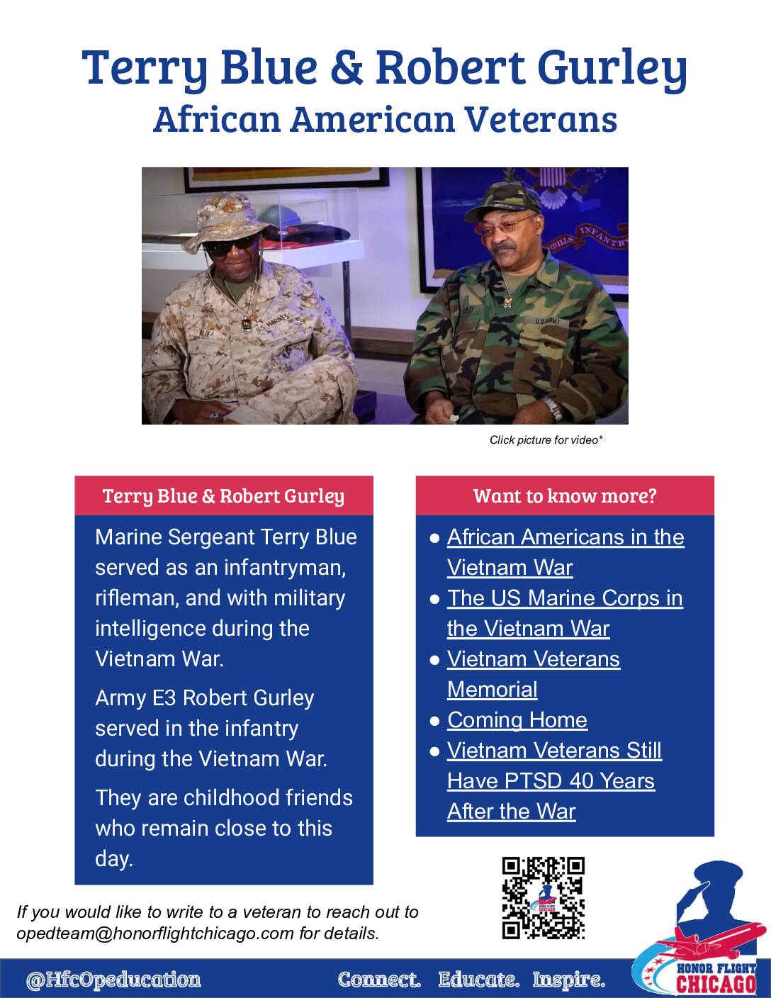 Marine Sergeant Terry Blue served as an infantryman, rifleman, and with military intelligence during the Vietnam War. Army E3 Robert Gurley served in the infantry during the Vietnam War. They are childhood friends who remain close to this day. Click on the image below to download the PDF with its embedded resources!