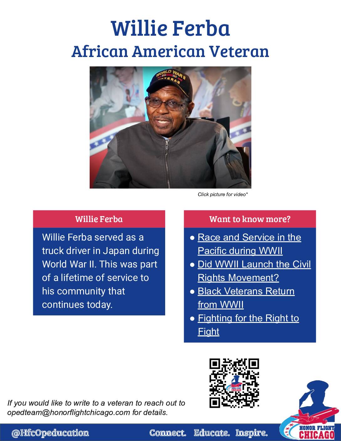 Willie Ferba’s is a story of a lifetime of service from his childhood on the streets of Chicago in the 1930s, to his service in the segregated military of World War II, to this very day in the Austin community he continues to serve. Willie’s grandmother told him “to always turn the other cheek” but Willie has spent all 95 years of his life quietly and respectfully standing up for what is right and bringing change in the process. We hope you will be inspired by his story and his spirit of service and community. “Have a blessed day.”