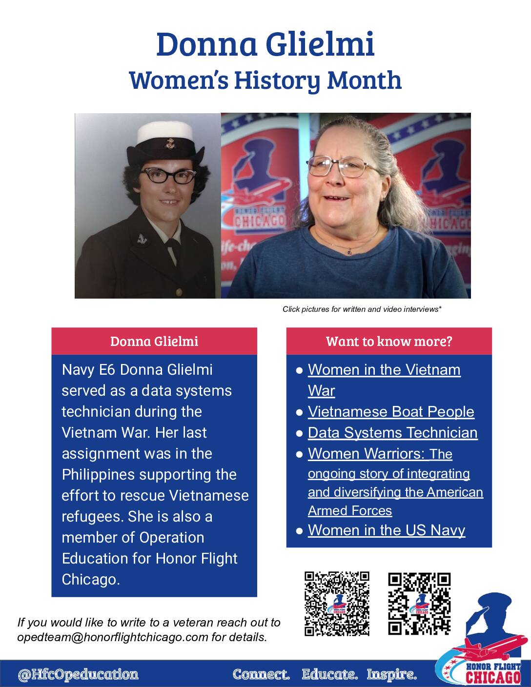 Navy E6 Donna Glielmi served as a data systems technician during the Vietnam War. Her last assignment was in the Philippines supporting the effort to rescue Vietnamese refugees. She is also a member of Operation Education for Honor Flight Chicago. Click on the image below to download the PDF with its embedded resources!
