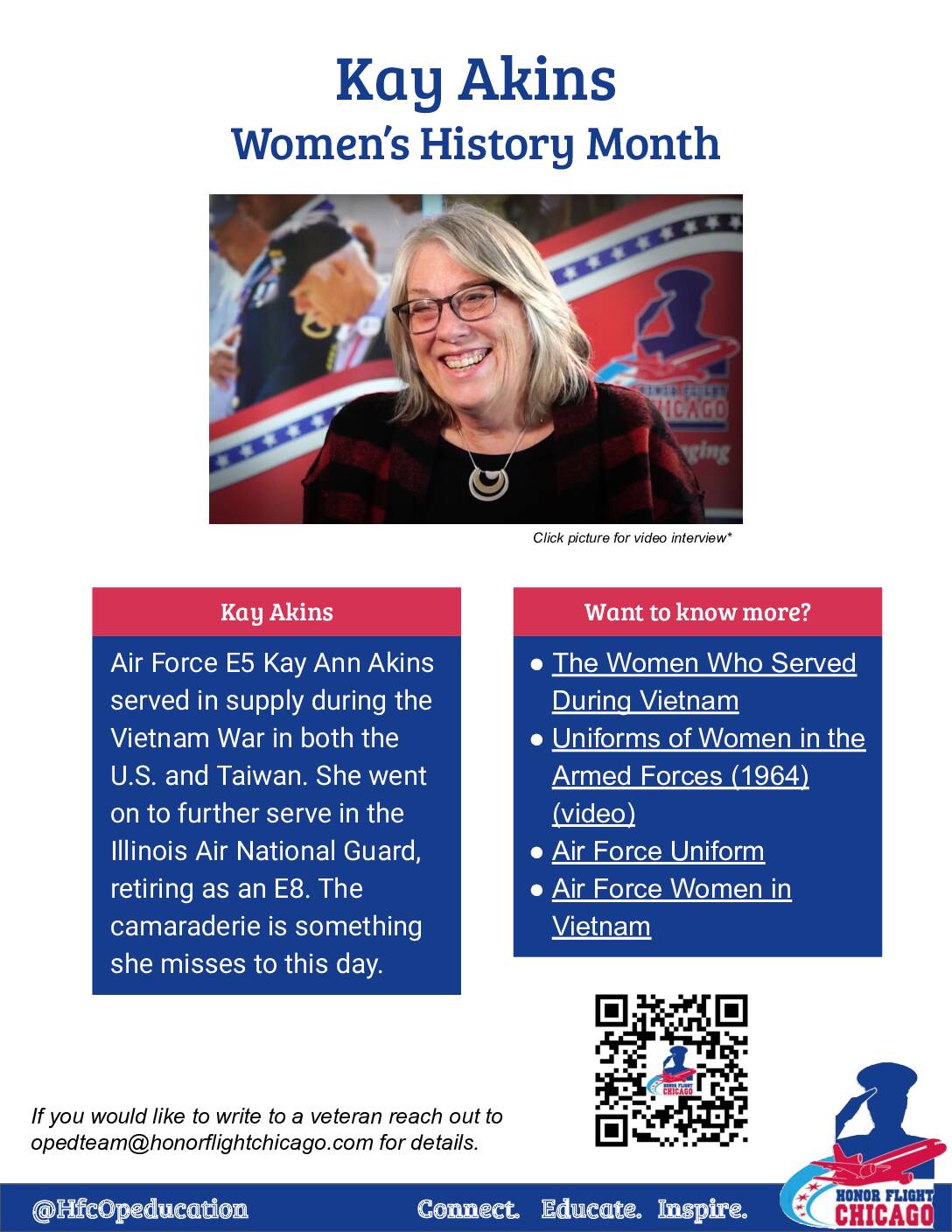 Air Force E5 Kay Ann Akins served in supply during the Vietnam War in both the U.S. and Taiwan. She went on to further serve in the Illinois Air National Guard, retiring as an E8. The camaraderie is something she misses to this day. Click on the image below to download the PDF with its embedded resources!