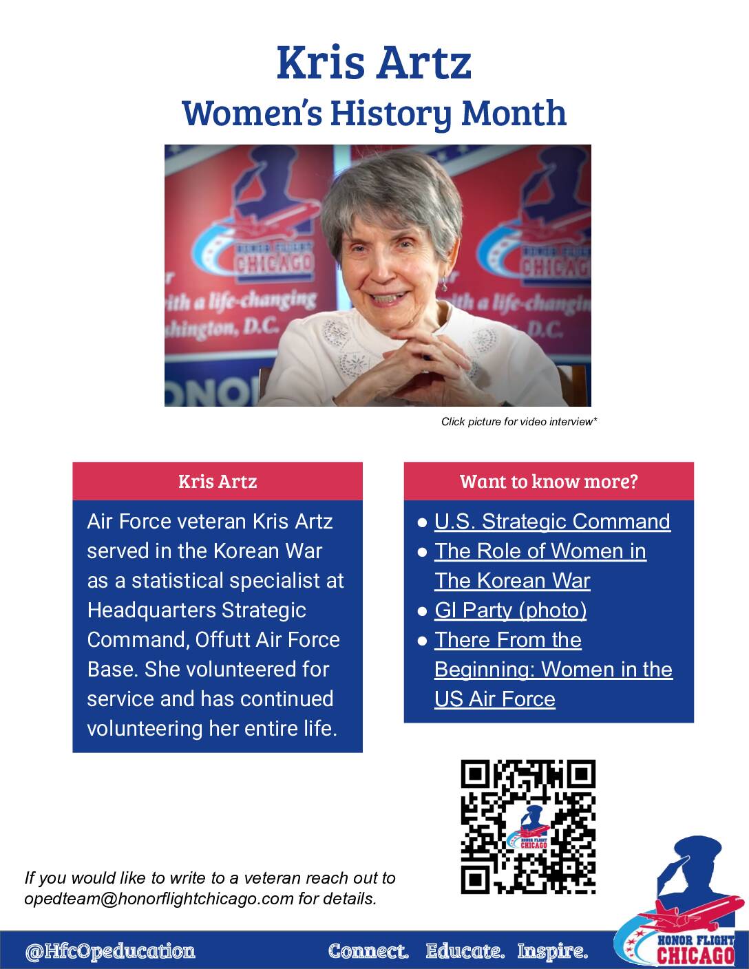 Air Force veteran Kris Artz served in the Korean War as a statistical specialist at Headquarters Strategic Command, Offutt Air Force Base. She volunteered for service and has continued volunteering her entire life. Click on the image below to download the PDF with its embedded resources!