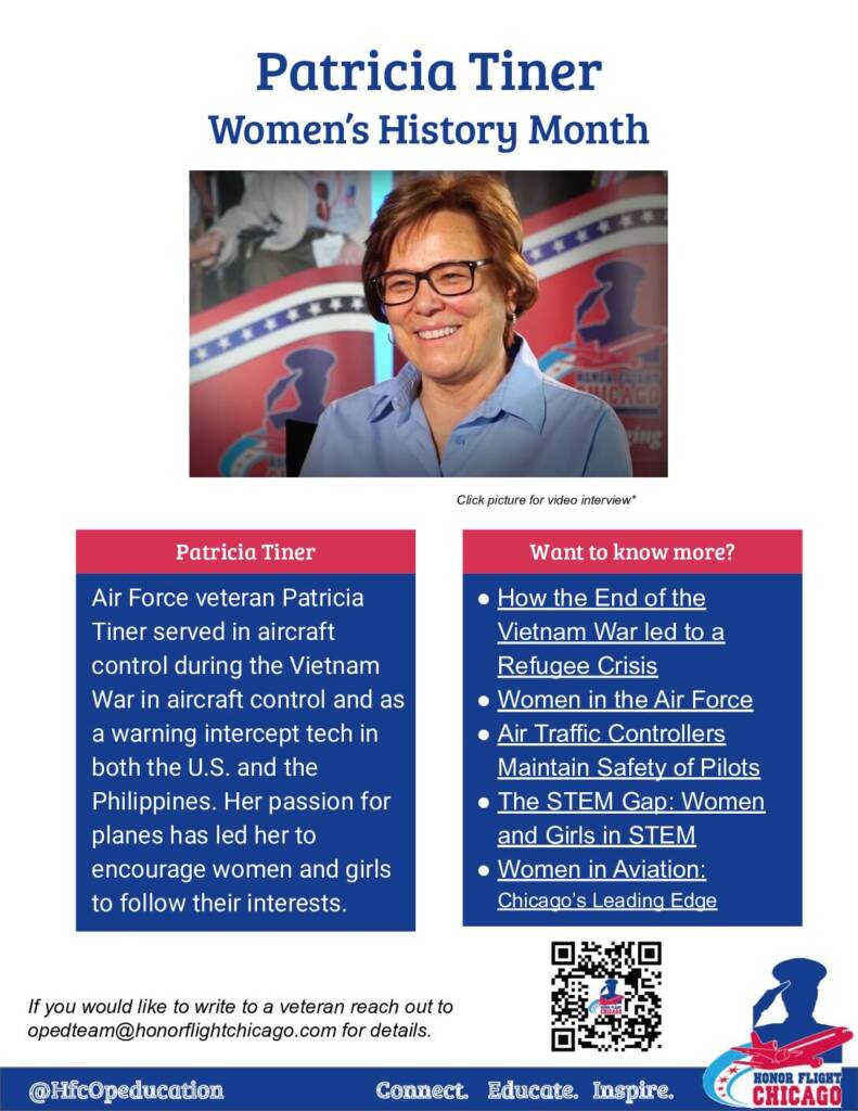 Air Force veteran Patricia Tiner served in aircraft control during the Vietnam War in aircraft control and as a warning intercept tech in both the U.S. and the Philippines. Her passion for planes has led her to encourage women and girls to follow their interests. Click on the image below to download the PDF with its embedded resources!