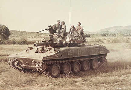 Robert told me that his crew would be out in the bush and away from base camp at times for up to 90 days. Some supplies were strapped on top and some stored inside. The crew slept outside the tank each night since room inside the tank was very limited and the walls were made of aluminum and not safe. On some missions his tank went out into the bush along with a company of infantry soldiers and sometimes without. Robert always had a soft spot for the infantry soldiers. “If we came across foot soldiers, I would have them hop onto the tank and I would give them a ride to their assigned location.
